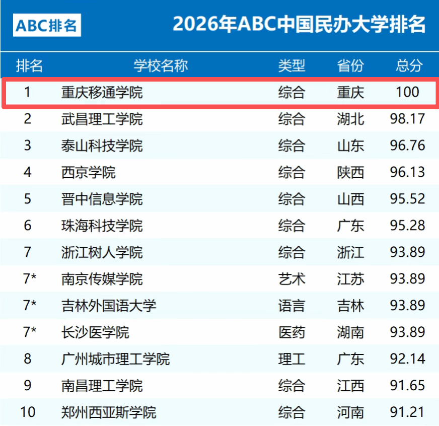 1月4日,2026年ABC中国大学排名正式发布,在全国240所民办普通本科院校中,重庆移通学院再次以综合评价总分第一的成绩,荣获2026年ABC中国民办大学排行榜第一名。这也是学校自2022年起,连续第五年稳居该榜单榜首,展现出持续领先的办学实力与稳定的教育质量。