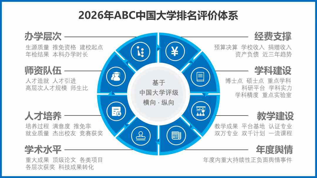 据悉,ABC中国大学排名由ABC咨询机构独家编制,并通过旗下中国大学排行榜(CNUR)网站正式发布。该榜单专注高等教育比较研究,研究成果在教育界和社会各界获得了广泛认可。排名成果被人民网、光明网、凤凰网及多家主流报刊深度报道,覆盖全网,已成为考生择校、高校发展的重要参考依据。 从榜单公开的评选机制来看,本次排名以客观数据为核心,结合年度教育发展热点,从办学层次、经费支撑、师资队伍、学科建设、人才培养、教学建设、学术水平以及年度舆情八个维度对高校进行系统分析。数据均来源于各校公开信息、教学质量报告、职能部门官网及权威媒体报道,确保了评价过程的公正性与结果的说服力。