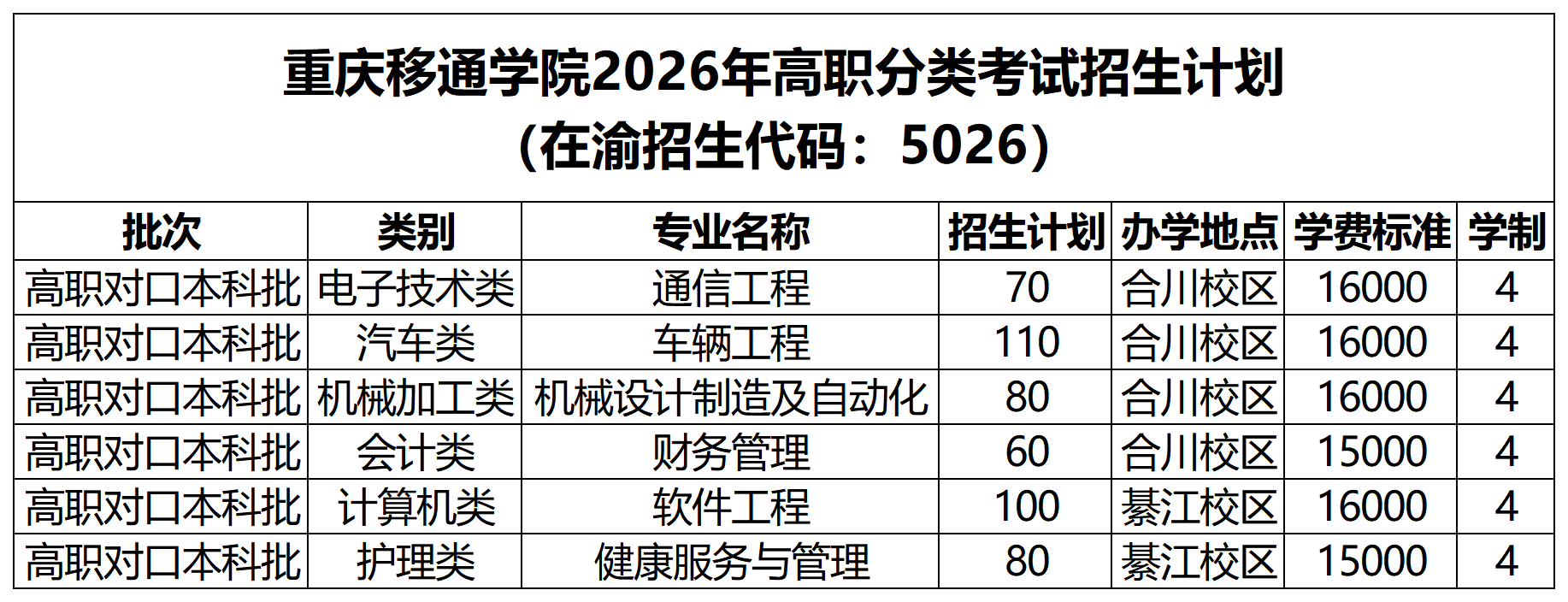 重庆移通学院 > 招生公告 > 2026年高职分类考试计划公布