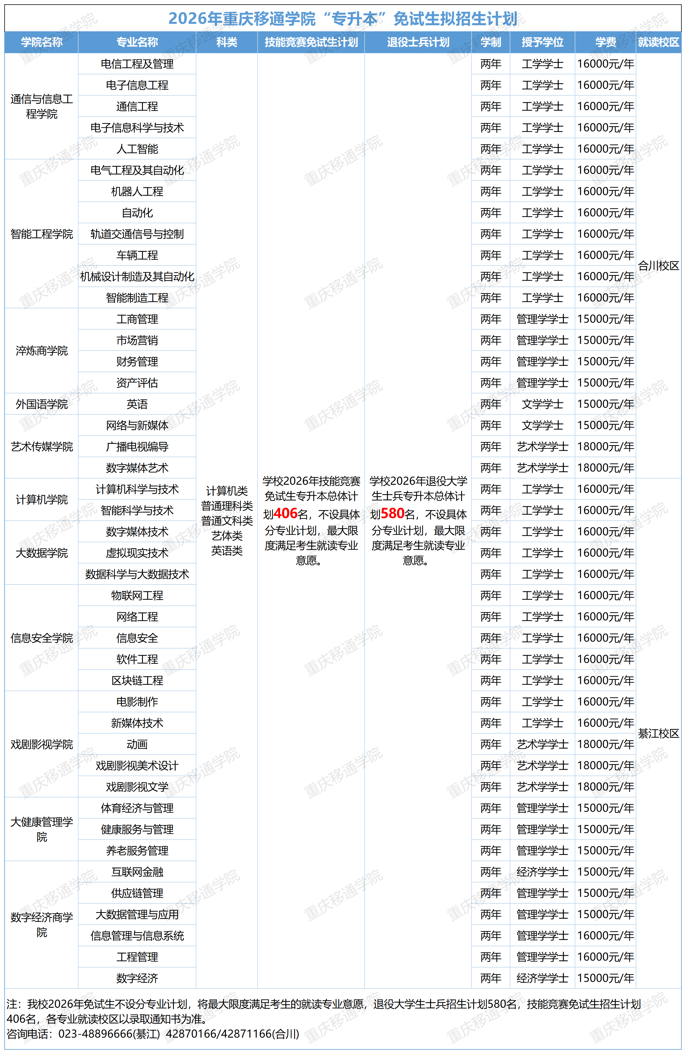 重庆移通学院 > 招生公告 > 2026年重庆移通学院专升本免试生拟招生计划